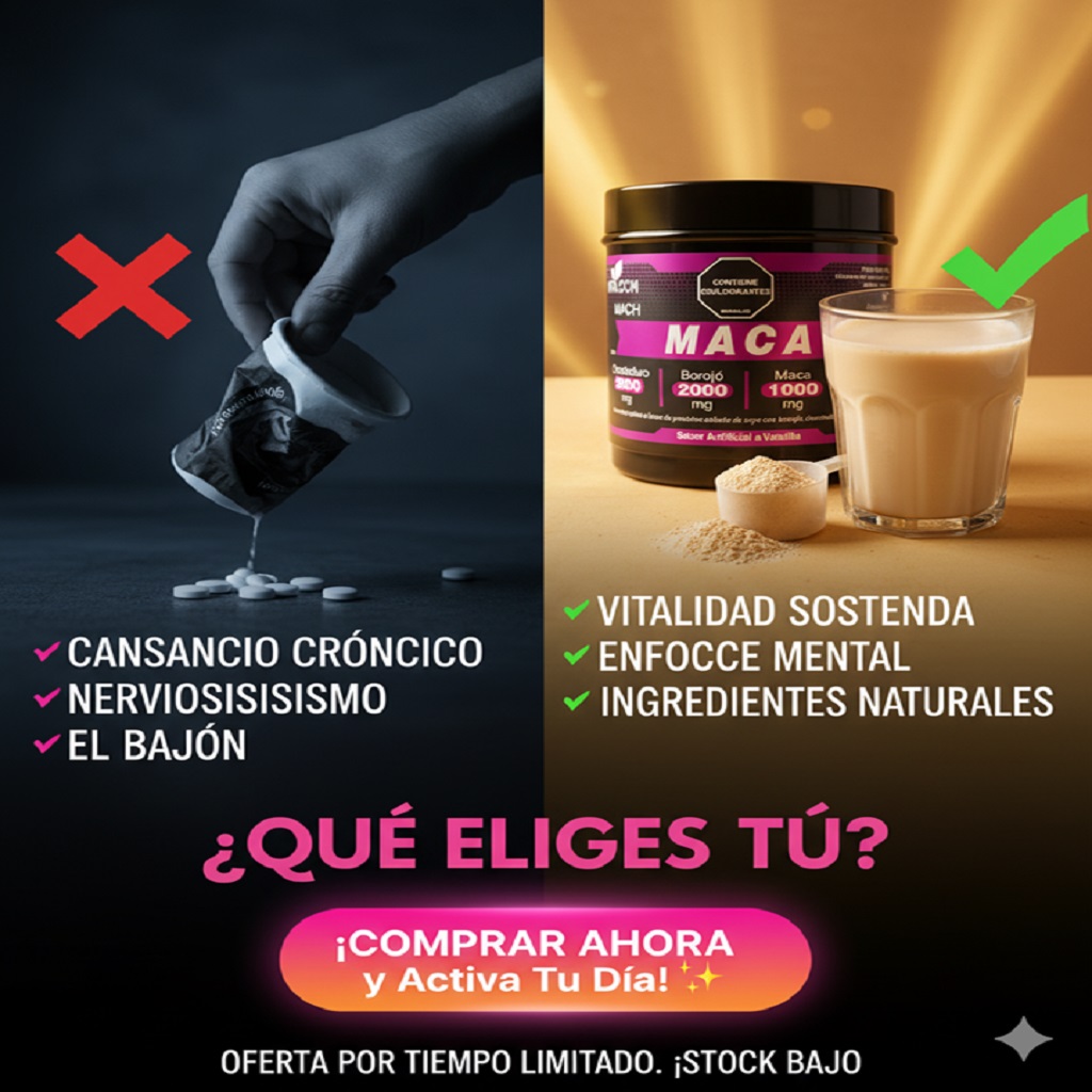 No, MACH MACA no es un estimulante artificial como el café. La Maca es un adaptógeno, lo que significa que ayuda a tu cuerpo a gestionar mejor el estrés y a producir su propia energía de forma natural, sin el temido “bajón” o nerviosismo del café. Generalmente es bien tolerado, pero como con cualquier suplemento, si tienes condiciones médicas preexistentes (como problemas de tiroides o hipertensión), consulta a tu médico.